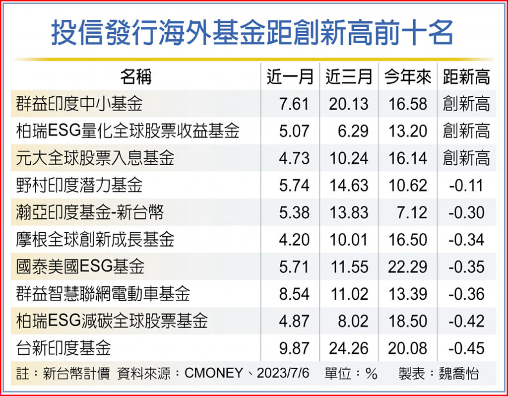 全球金融市場近期呈現高檔震盪,但統計752檔海外基金中,共有包括群益印度中小、柏瑞ESG量化全球股票收益、元大全球股票入息三檔基金淨值創下新高,以淨值距新高幅度來看,印度基金表現相對佳。