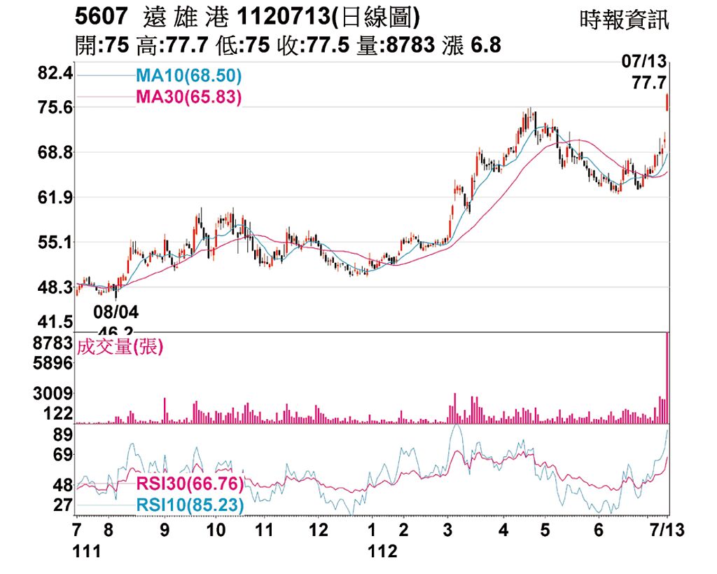 遠雄港(5607)13日帶量跳空拉出長紅棒,一度攻上漲停77.7元,終場收77.5元、上漲9.61%,股價創新高,成交量放大到8,726張,外資連四日買進力挺。上檔無壓,KD指標在強勢高檔區,多方氣盛,拉回跳空缺口不補,仍有機會持續創高。