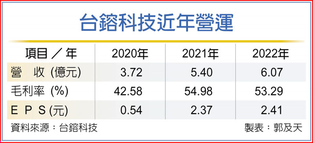 台鎔由觀音廠提供穩定獲利,客戶涵蓋一線半導體廠、面板廠商,2021~2022年隨處理量增加,毛利率穩定在50%~55%,去年營收6.07億元、EPS為2.41元。