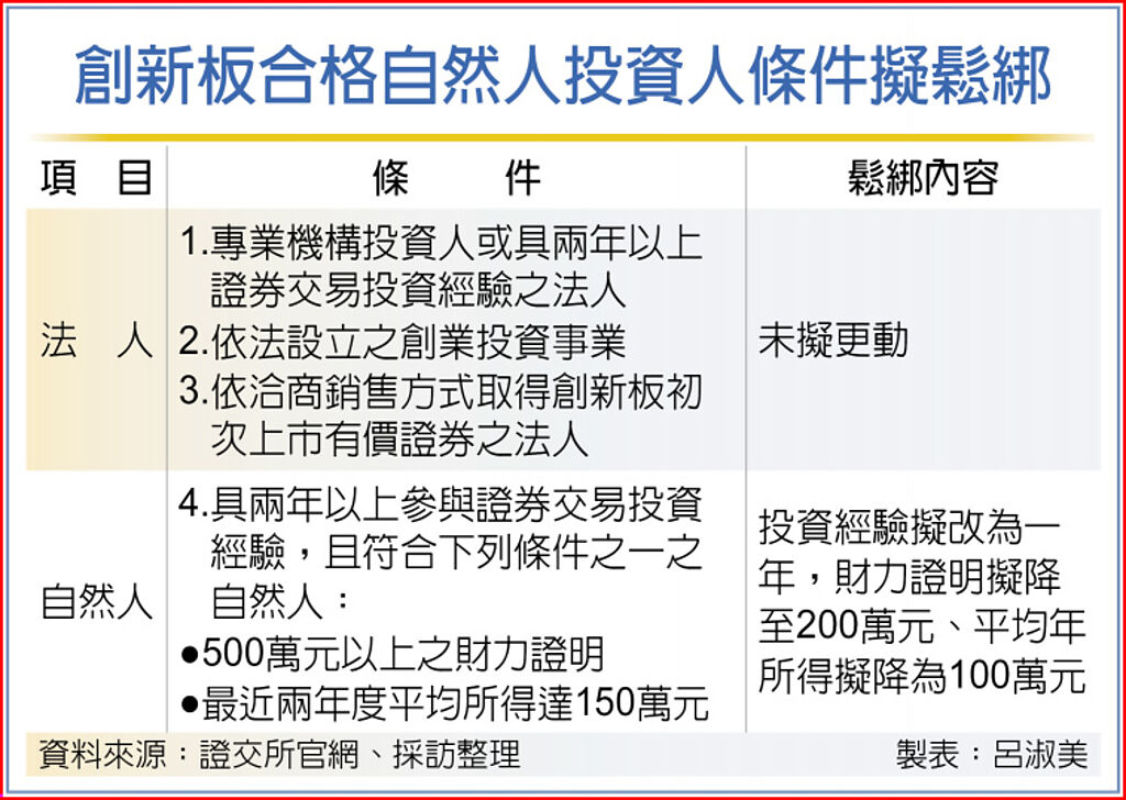 為活絡創新板交易,投資創新板合格「自然人」條件,擬大幅鬆綁,將投資經驗由兩年放寬為一年,且財力證明由500萬元降至200萬元或近兩年平均所得由150萬元降至100萬元,惟仍有待金管會同意後對外發布。