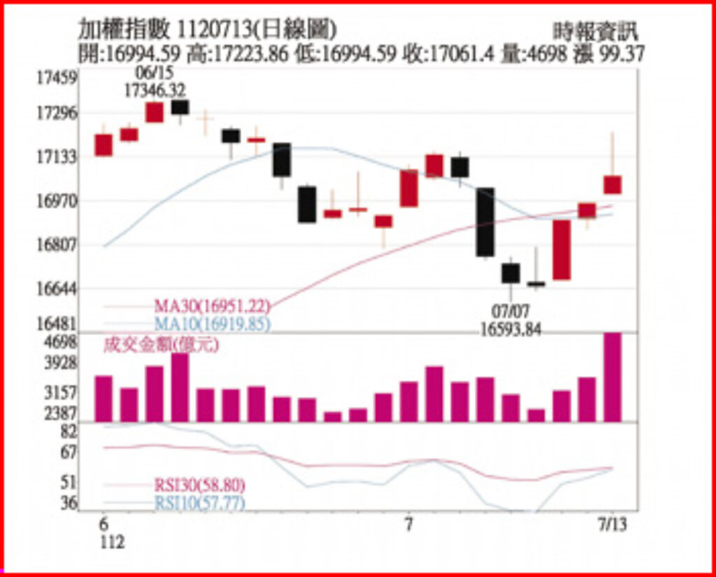受惠AI伺服器等相關商機,半導體股反應此一利多而明顯上漲,也帶動加權、櫃買指數同步攀升,並創下年度新高。6月上半月仍是驚驚漲局面,在AI伺服器掌大旗下,電子股走勢淩厲,而指數創下17,346點波段新高後在高檔出現價量背離的跡象,且受到Fed官員升息鷹派言論、中美科技戰及法人季底結帳等因素,最終收在16,915.54點,月漲幅約2%。