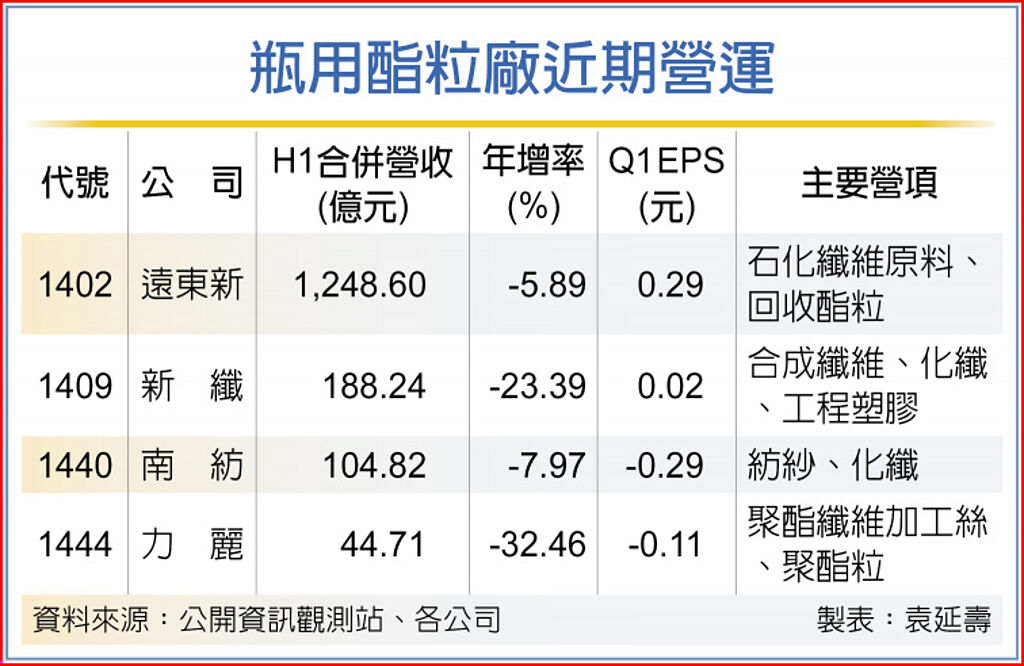化纖族群受市場需求不振、大陸對手低價傾銷,產線稼動動平均跌破5成,唯獨固聚酯粒、瓶用酯粒在民生必需支撐下,表現一支獨秀,國內主要瓶酯廠遠東新(1402)、新纖(1409)、力麗(1444)訂單能見度已到第四季,今年營運仍可保持水準之上。