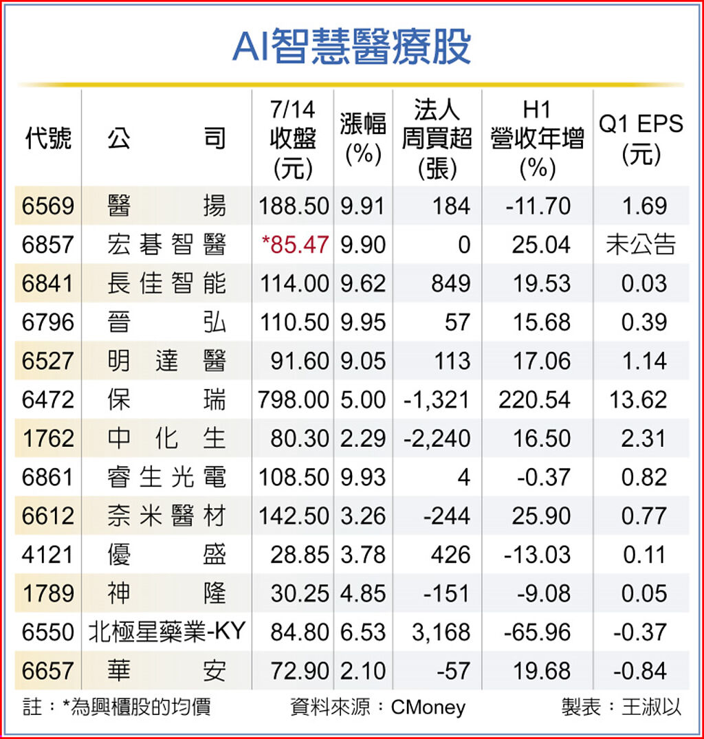 醫揚為輝達的醫療設備供應商,14日股價已拉出第三根漲停。醫揚提供符合醫療安全規格的AI運算,開發出多項AI醫療產品,包含影像分析、醫療電腦、行動護理等,並獲得歐美等國際醫療業者採用,AI醫療設備營收比重攀升至1成。