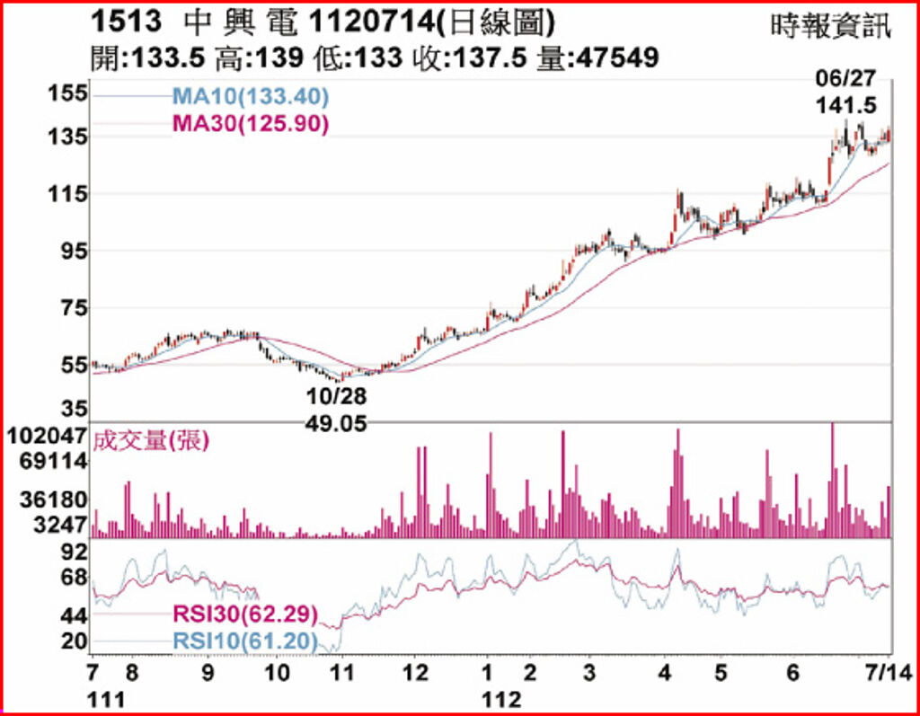 中興電(1513)受惠台電強韌電網計畫,上半年營收創新高。股東會通過配息3.5元,公司債轉換成股票後,配息調整為3.31元,14日除息參考價130.69元,開盤3分鐘快速填息,三大法人合計買進7,760張,終場大漲7元、收在137.5元。技術線型收復5日、10日及20日均線。