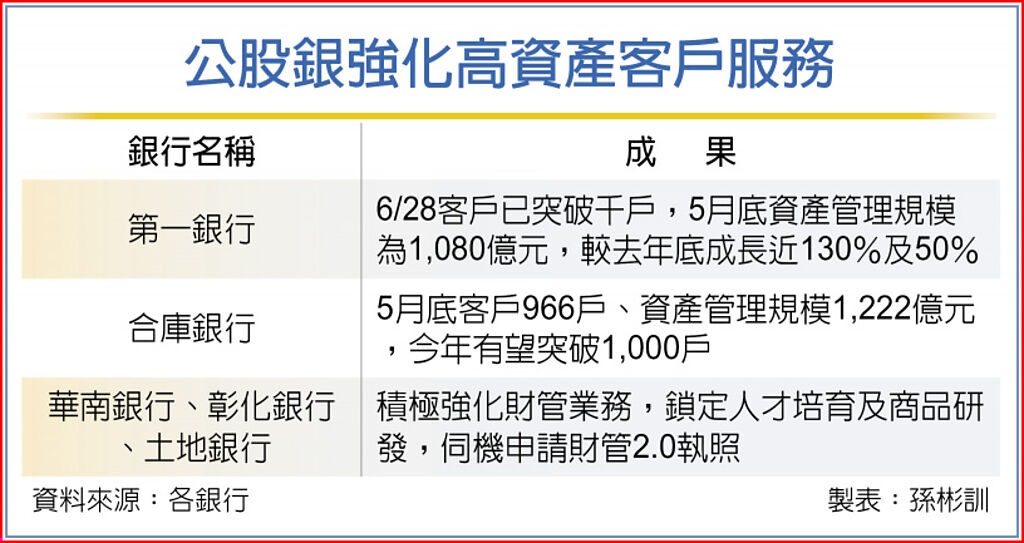 公股銀積極強化財富管理2.0,高資產客戶今年穩定成長,其他尚未取得財富管理2.0執照的銀行也積極強化,希望未來申請相關執照。第一銀行最新統計至6月28日,已簽署高資產客戶數突破1,000人,5月底AUM為1,080億元,較2022年底已分別成長近130%及50%,未來將持續在產品、服務及關係維護上著手,以提升經營成果。