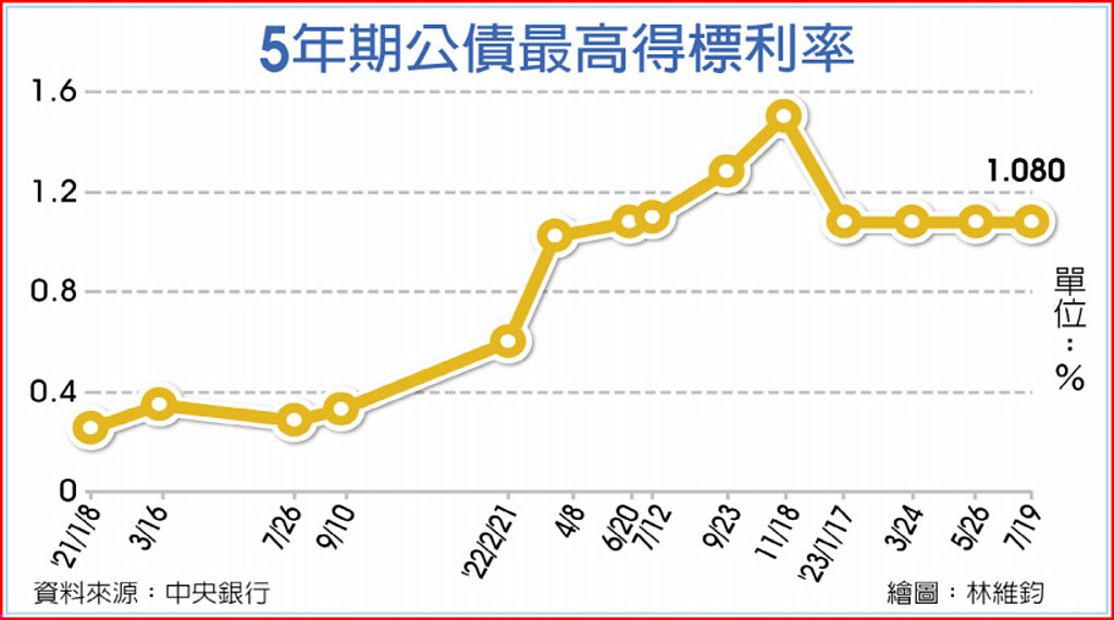 中央銀行14日受財政部委託標售300億元5年期公債,最高得標利率為1.08%,較5月標售同天期持平,但仍高於1月標售同天期的1.077%。本期5年新券僅吸引403億元資金搶標,最高得標利率僅1.08%,投標倍數亦降至1.61倍。銀行資金調度主管指出,短債利率下不去、長債利率則持續下行,未來台債不排除也將出現利率倒掛情形。
