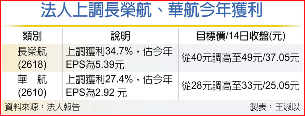 整體而言,鑑於客運市況強勁,國內法人上調長榮航、華航今年獲利預估34.7%及27.4%,EPS將分別達5.39元及2.92元,也同步調高目標價,重申買進評等。 |