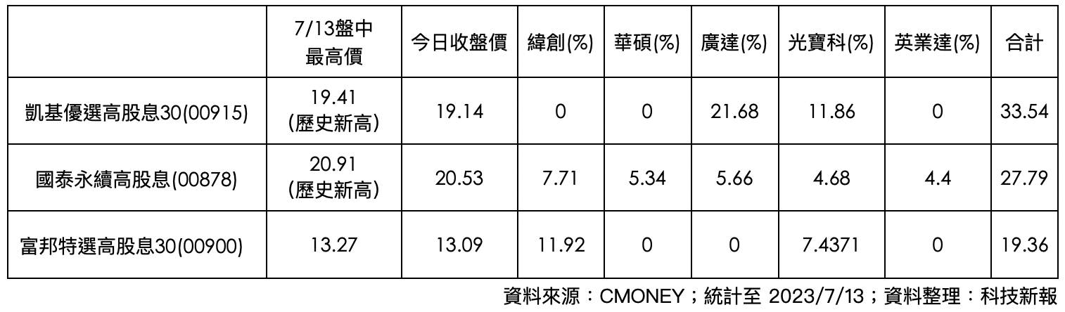 AI 伺服器概念股近日就是台股主流,緯創、廣達、光寶科、英業達今日盤中全數漲停,受惠持有 AI 成分股的台股 ETF 買上去,凱基優選高股息 30(00915)、國泰永續高股息(00878)股價盤中跟著創歷史新高,其中 00915 持有廣達 21.68%、光寶科持有 11.86%,00878 前五大成分股持有 27.79%,而富邦特選高股息30(00900)持有緯創 11.92%。