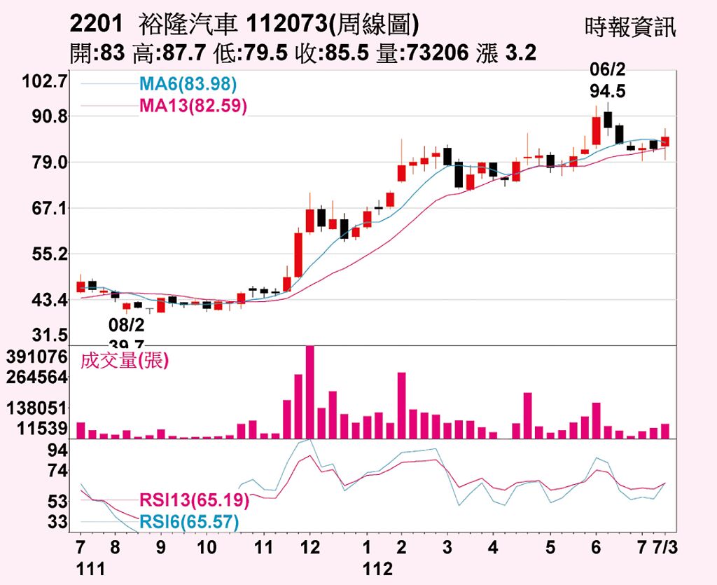 裕隆(2201)旗下新店裕隆城即將9月開幕,再加上納智捷n7電動車可望年底量產拚交車,上周股價連續三日上漲,14日早盤急拉觸及87.7元,終場收85.5元,站穩短中長期均線之上,單日成交量放大至31,029張,三大法人連三天合計買超9,583張。