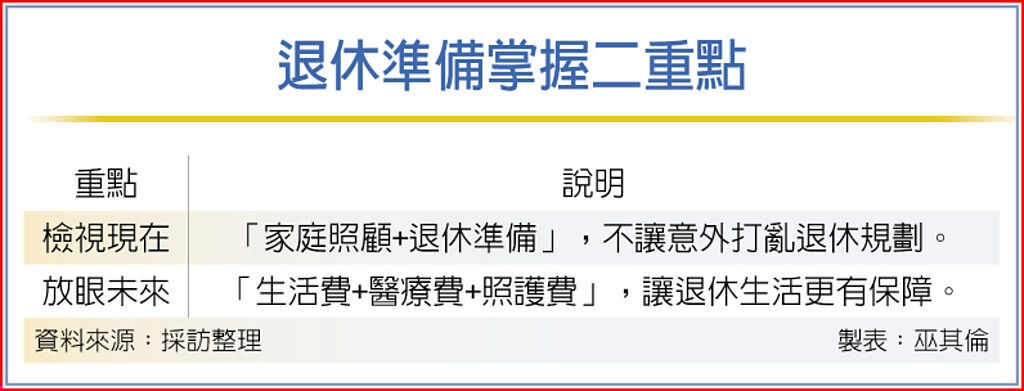 考量到年紀增長,老後醫療的需求與開銷也比青壯年還高,因此愈來愈多人透過保險規畫退休,預先建構退休安全防護網。全球人壽商品部副總賴庭宇建議民眾,可從二大重點著手規畫,一是「檢視現在」,先檢視自己的家庭責任,若不幸發生意外或疾病,是否有能力支付醫療及照顧花費,且不造成家庭經濟壓力,對於後續選擇保險種類,是相當重要的檢視工作。二是「放眼未來」,除要思考該如何在退休後維持穩定生活費,並要針對退休後醫療及照護做完整規畫,才能讓退休生活更有保障,更有尊嚴;若不幸發生突發狀況時,周全的保險計畫能將其為生活帶來的影響與衝擊降到最低。