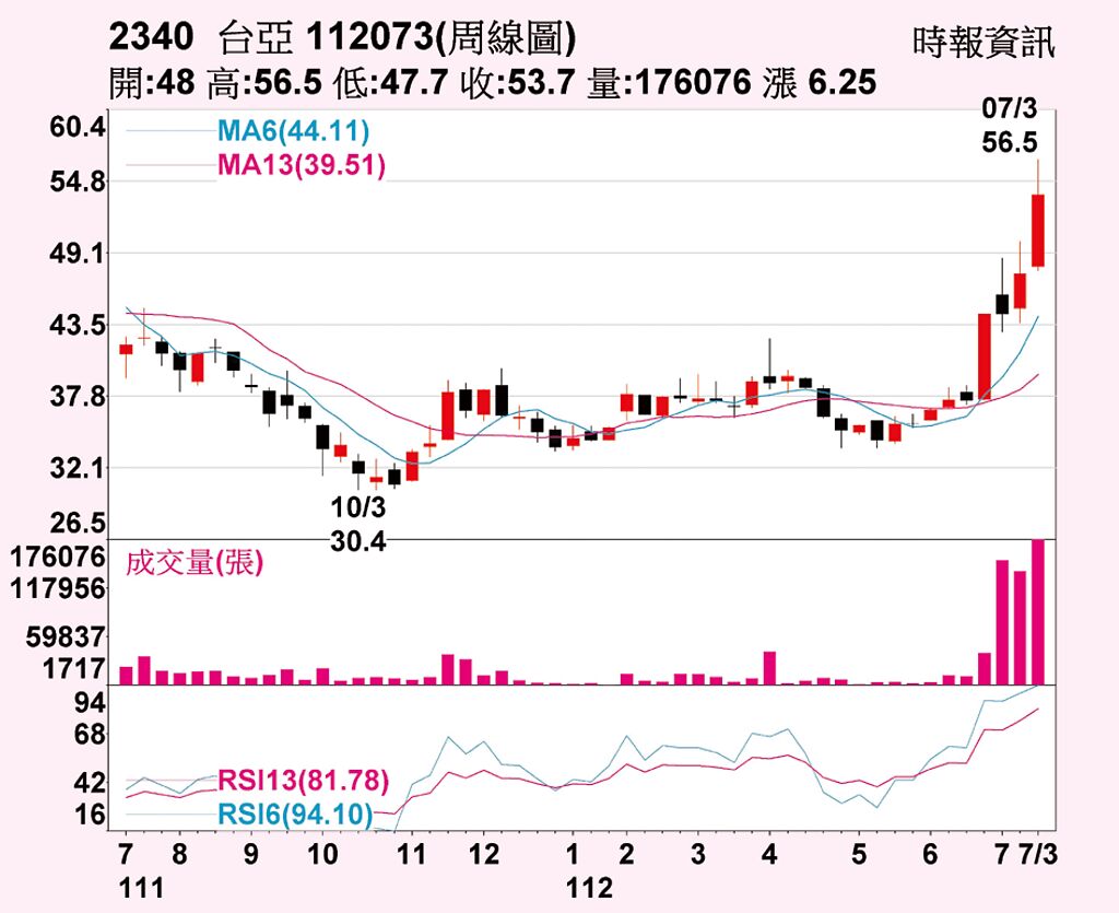 台亞(2340)將於本月26日舉行法說會,隨著公司積極布局第三代半導體,氮化鎵今年可望挹注台亞營收,轉投資積亞半導體主攻碳化矽,也積極建置產能,台亞股價站穩50元整數大關,14日持續高檔震盪,終場仍大漲超過半根漲停,以53.7元作收,周K、月K均連紅。