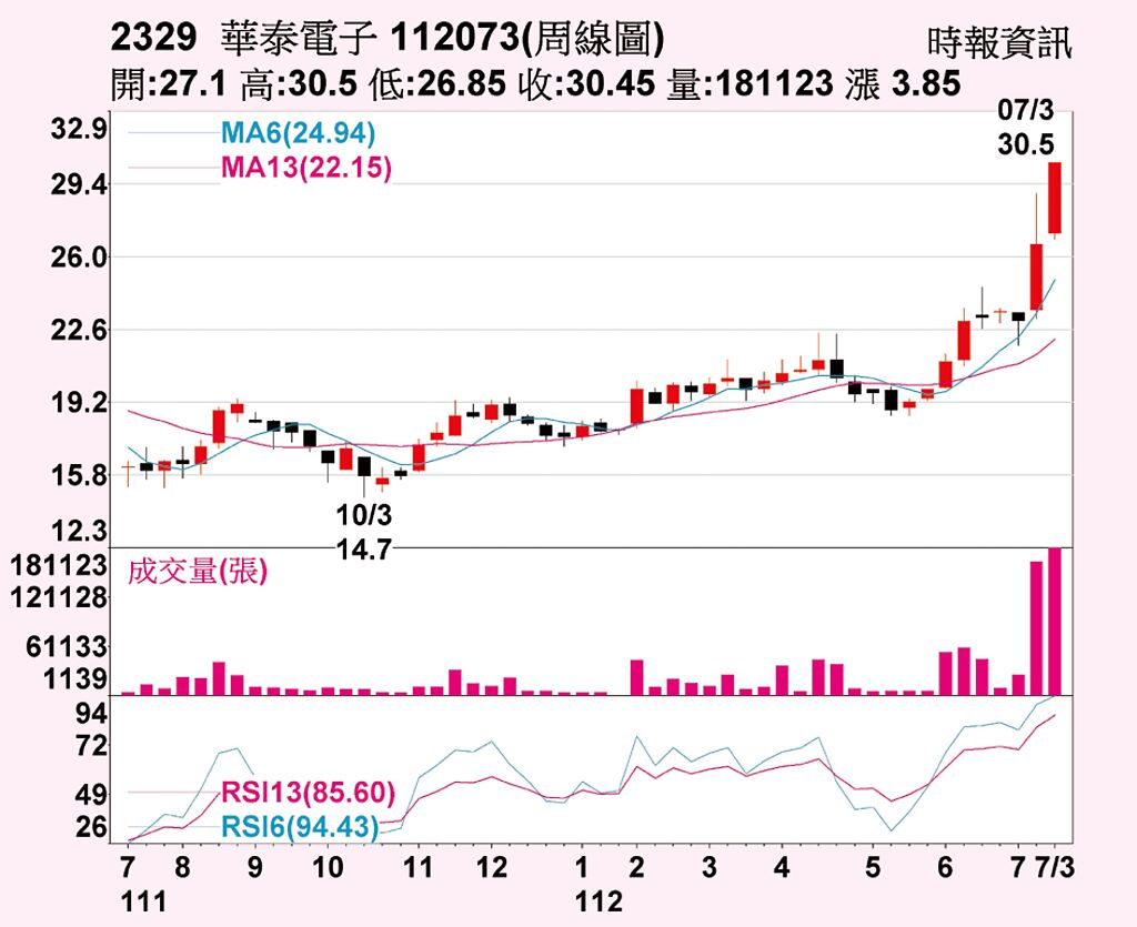 封測廠華泰電子(2329)第二季營收39.98億元,較上季大幅成長22.91%,累計上半年營收72.52億元,較去年同期減少10.77%,累計營收年減幅度持續縮小,下半年營運可望回升下,近期股價轉強,14日上漲5%,收在30.45元,寫下波段新高,技術面上,近二周以來,價量呈現多方格局,量能放大並持續推升股價走高。