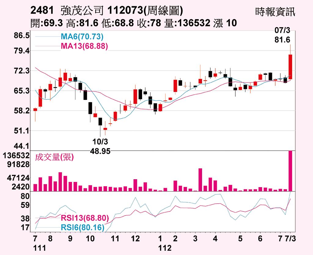 強茂14日開盤緩步墊高,收盤收78元,漲幅達3.72%,近期均線多頭上彎,外資7月累計至14日,共計買超4,006張,周成交量亦放大至13.6萬張,創一年以來最多,多頭企圖心強烈。 |