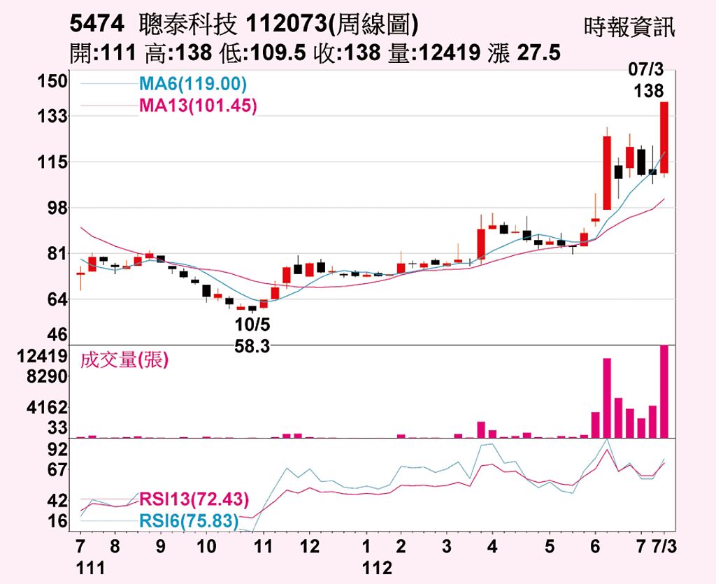 聰泰(5474)上周四及周五連續兩個交易日,呈現價量齊揚的走勢。14日以138元漲停價收盤,單日上漲12.5元。14日成交量為4,656張,13日為3,878張,均較前五日平均交易量放大3倍左右,周K線拉出一根長紅棒。