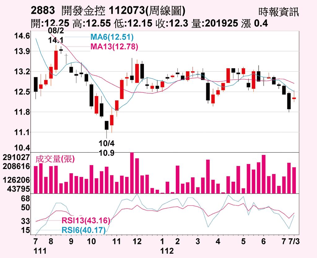 開發金14日股價收12.3元,上漲0.15元,累計近五個交易日股價上漲0.4元、3.36%。 |