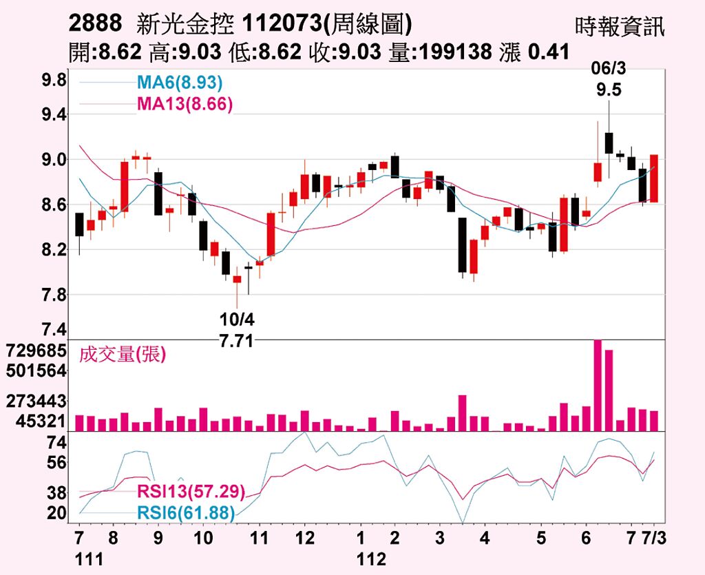 新光金股價14日收在9.03元,累計近五個交易日股價上漲0.41元、4.76%。三大法人合計周買超42,461張、其中外資買超40,685張、投信賣超269張、自營商買超2,045張,周線翻紅,帶動5日均線向上突破月線,且日KD、月KD都呈現向上交叉,中短期格局偏多。 |