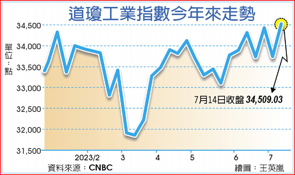 由於美國6月消費者物價指數(CPI)與生產者物價指數(PPI)年增率雙雙降溫,加上財報季登場,率先發布業績的銀行股財報皆優於預期,投資人信心大振,美股上周周線拉出長紅,其中道瓊工業指數還連漲五天,全周大漲逾2%,那斯達克周線勁揚3.3%,同創3月來最大漲幅。