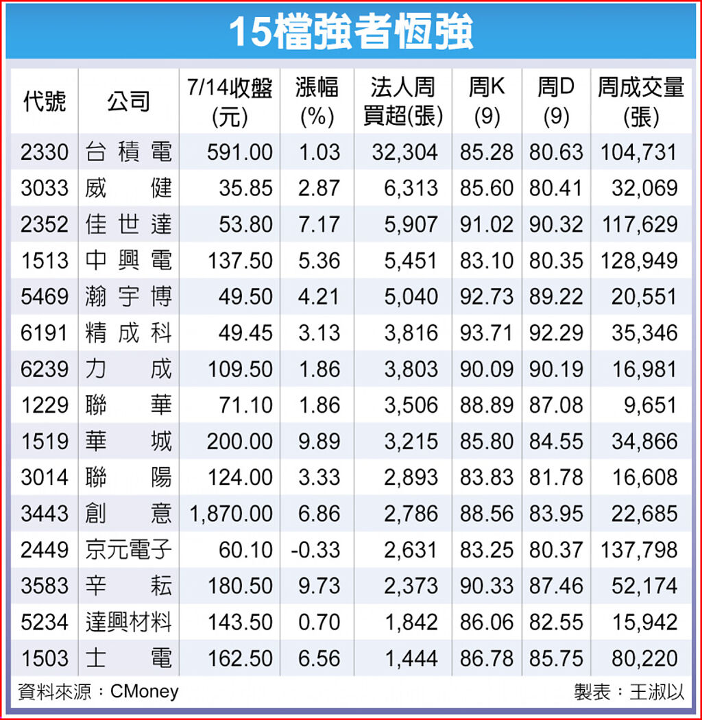 匯總康和證券、台新投顧、統一投顧選股邏輯,認為台股處多頭局勢,投資人買股仍是選強不選弱。具體選股策略是,挑選技術面9周KD均超過80以上強勢鈍化、近一周三大法人買超及周成交量比前一周增加個股,依序有台積電、威健、佳世達、中興電、瀚宇博、精成科、力成、聯華、華城、聯陽、創意、京元電子、辛耘、達興材料、士電等。