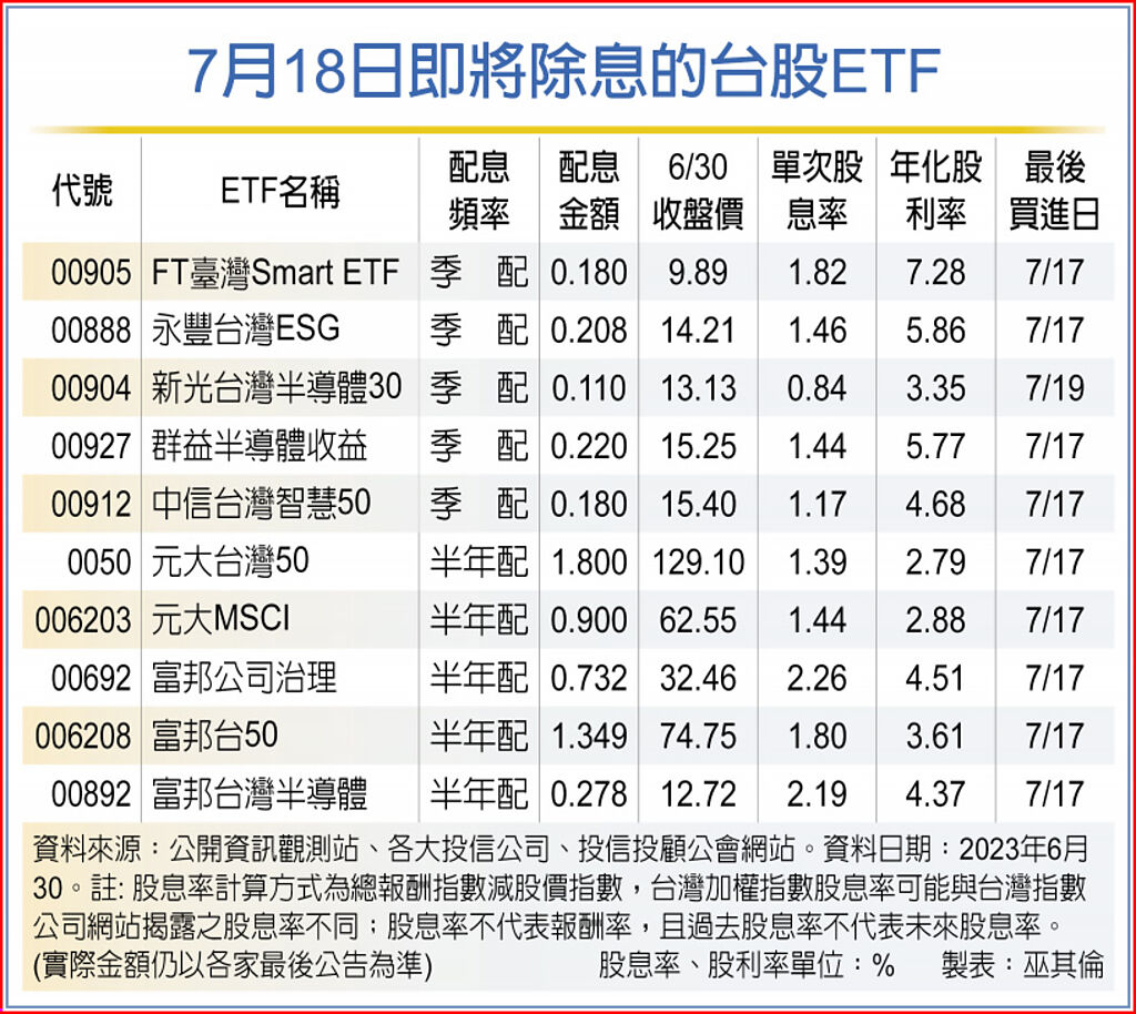 投信表示,台股下半年行情仍樂觀看待,觀察7月將除權息的台股ETF中,以富蘭克林華美FT臺灣smart ETF(00905)基金6月30日淨值9.89元,相對其他檔ETF低,且績效卻不輸同類ETF,今年高息型台股ETF表現亮眼,00905年初至今報酬也超過25.34%,近三個月也有11.45%報酬。