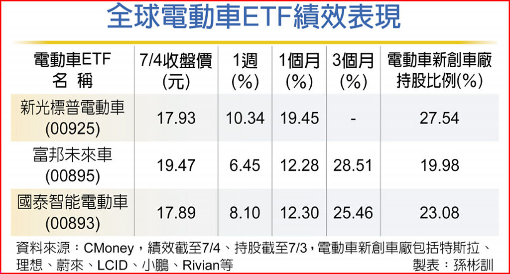 特斯拉降價奏效,第二季出貨創新高,最新股價創下新高,美股電動車新創族群包括蔚來、理想、小鵬、Rivian與Lucid股價也衝高,海外電動車ETF股價更重啟新一波漲勢,電動車相關基金長線投資潛力大增。