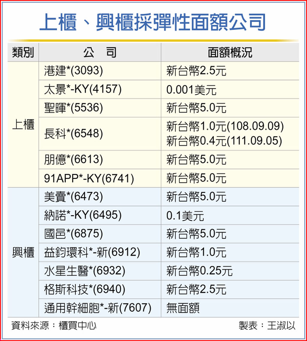 此外,在興櫃公司的新創公司採取彈性面額的家數則以生技醫療股為主,例如有國邑*(6875)每股面額為新台幣5元,水星生醫*(6932)每股面額為新台幣0.25元。