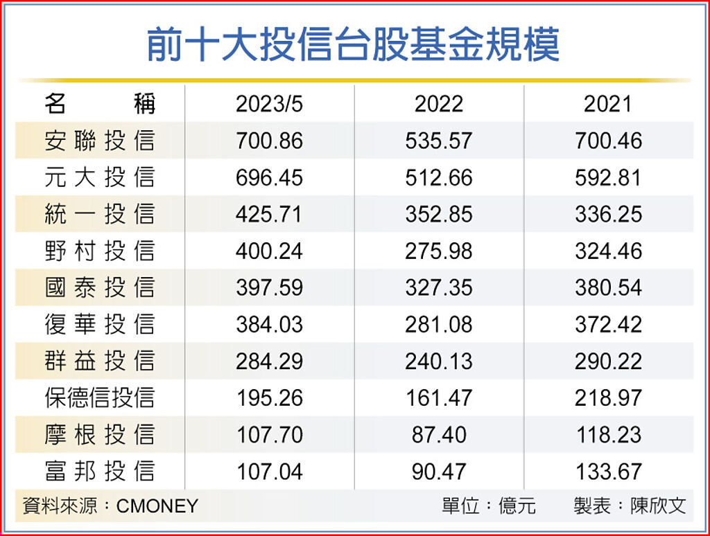 去年台股基金受到市場劇烈波動波及,拖累整體績效與規模表現,以個別投信公司排名來看,去年底排名前五大的投信公司分別為安聯投信、元大投信、國泰投信、統一投信與復華投信,規模約在280億元至535億元之間;與5月底相較,規模持續排名第一大的安聯投信,整體台股基金規模已經衝上700億元,重回2021年底時的水準,元大投信也從512億元回到696億元,統一投信、野村投信更因績效表現出色,均以超過400億元的規模直接衝上第三、第四名。