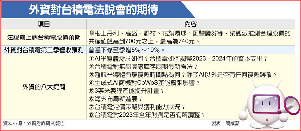 彙整外資圈觀點,台積電20日法說會焦點包括:一、AI半導體的需求如何?台積電在此環境中,如何調整2023、2024年的資本支出?二、台積電對無晶圓廠庫存周期最新看法。三、邏輯半導體循環復甦時間點為何?除了AI以外是否有任何復甦跡象?四、生成式AI商機對CoWoS產能擴張影響。五、3奈米製程產能提升計畫。六、海外布局新進展;七、台積電定價策略與獲利能力狀況;八、台積電對2023年全年財測是否有所調整?
