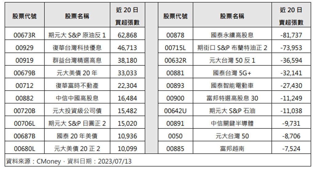 至於官股行庫近20日ETF賣超前十大,科技型及市值型ETF各佔3檔,原油及高股息ETF各佔2檔,其中,調節最多的是國泰永續高股息(00878),賣超81,737張,第二、三名則為期街口S&P布蘭特油正2(00715L)及元大台灣50反1(00632R)。另外一檔高股息富邦特選高股息30(00900)則是居ETF賣超第六名。