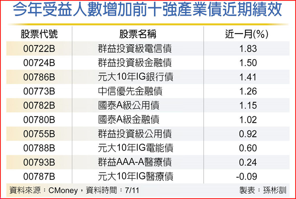 市場預期升息漸近尾聲,帶動今年來債券ETF買氣,其中產業債ETF更是每檔受益人數都呈現增加,超過六檔受益人數增加逾千人以上,包括群益投資級電信債、群益投資級金融債、中信優先金融債、國泰A級金融債、元大10年IG電能債及群益投資級公用債,凸顯現階段布局電信債、金融債優先。