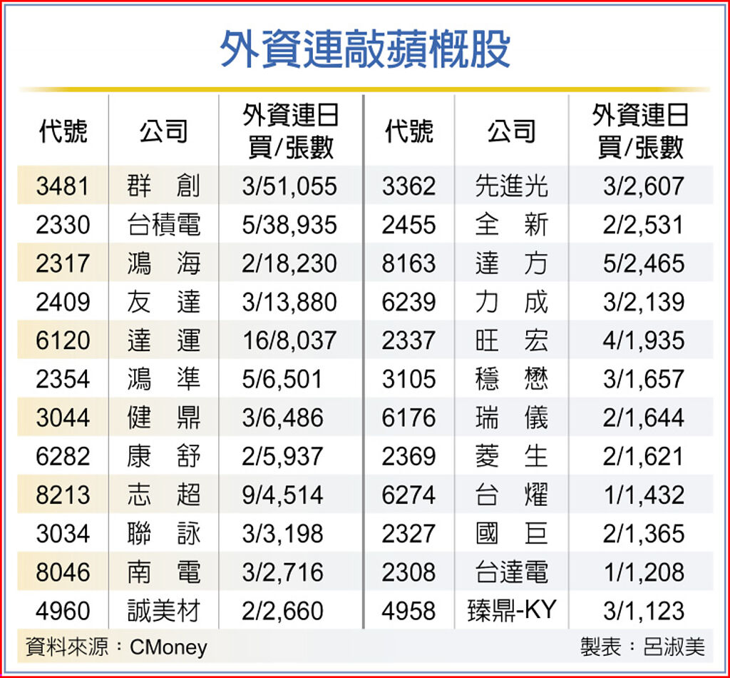 篩選外資17日轉為買超蘋概股逾千張,或連買達千張以上計有25檔,以群創連三日買超5.1萬張最多,其次為台積電連五日買超近3.9萬張,鴻海連二日買超1.82萬張及友達連三日買超近1.39萬張最多。