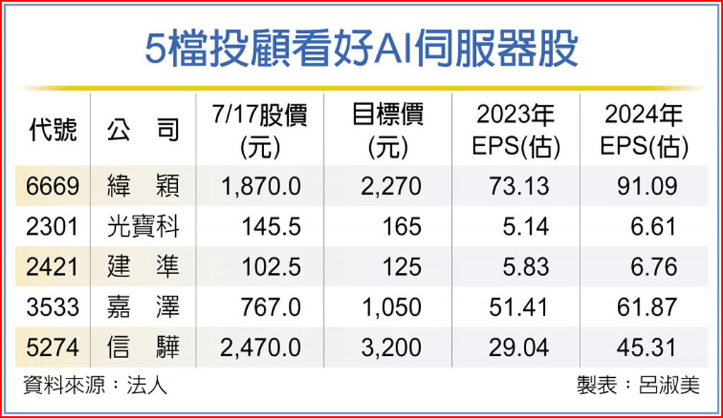 國票投顧最新出具伺服器產業報告指出,AI伺服器無畏景氣疲弱,需求動能強勁,可帶動緯穎(6669)、光寶科(2301)、建準(2421)長線業績表現;另伺服器新平台放量將使嘉澤(3533)、信驊(5274)受惠。