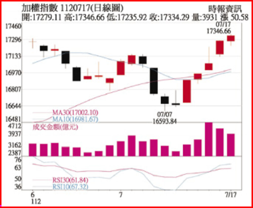 在AI相關概念股全面領漲,13日上沖下洗爆量4,713億元,在技術面量先價行,17日盤中指數突破6月中旬高點,最高來到17,346.66點。