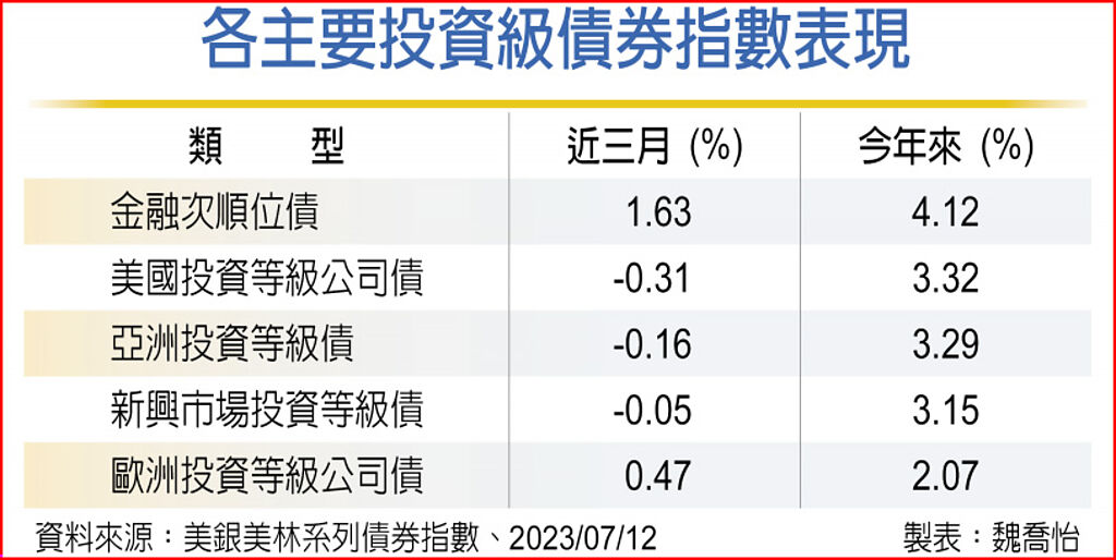 美國聯準會(Fed)6月暫停升息,今年以來各主要投資級債券指數表現,也擺脫去年陰霾而走揚,其中金融次順位債表現最佳,漲幅近4.12%。投信法人表示,升息循環有望在今年告終,訴求穩健配置的資金預料回流投資級債,金融債基於其產業穩健、收益率又相對誘人,可望吸引資金布局,後市表現值得關注。