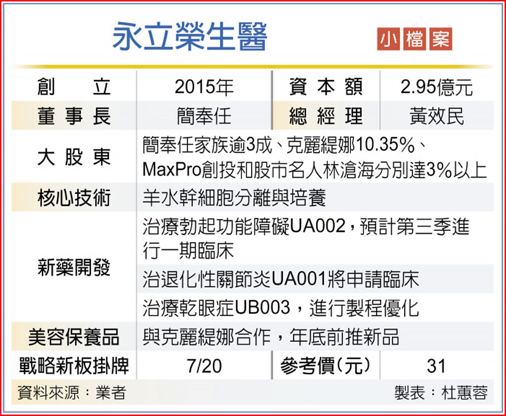 細胞治療股添生力軍!永立榮生醫(6973)預計20日掛牌櫃買戰略新板,每股參考價31元。永立榮董事長簡奉任表示,旗下有三個新藥開發中,進度最快的治療勃起功能障礙新藥UA002,預計第三季在台灣進行一期臨床,未來二期臨床則會在台、美同步收案。