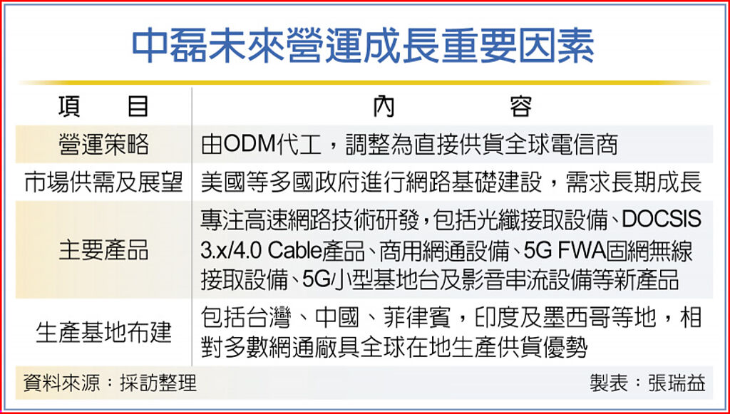 雖然今年全球網通市場仍維持正向,不過,中磊在去年全年營收基期拉高之後,預期今年全年營收成長幅度將趨緩,不過,該公司表示,今年公司重點在於調整營運體質,希望更進一步優化營運績效表現。