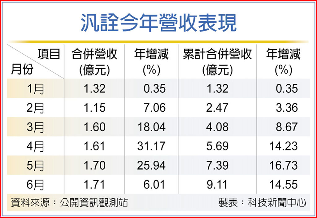 汎銓科技去年以來持續進行人員擴編,加上今年以來國際大廠客戶需求仍保持穩健,使該公司第二季營收則締造單季新高,第二季合併營收5.03億元,分別季增23.32%、年增19.81%,並締造歷年單季營收新高。累計今年上半年合併營收達9.11億元,年增14.55%,同步創歷年同期新高記錄,後市該公司在採購新設備陸續到位下,對未來營運持續樂觀。