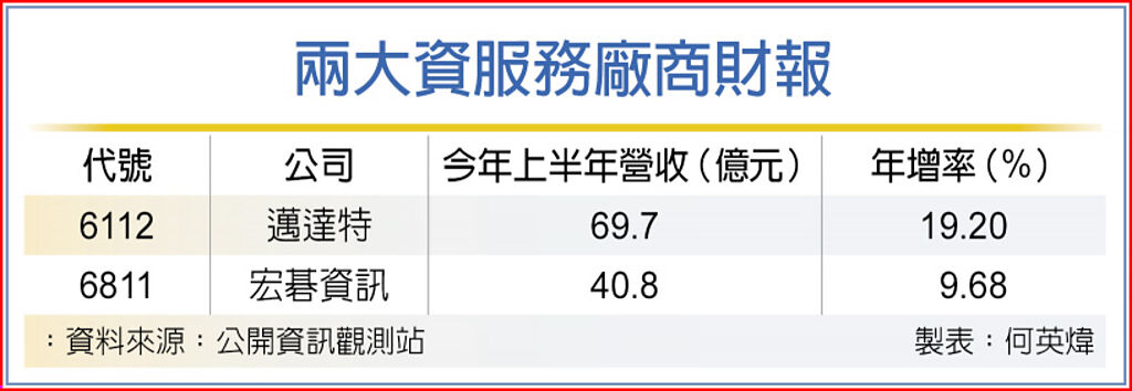 企業雲端服務需求成長力道強勁,佳世達旗下的資訊軟體服務商邁達特(6112)與宏碁集團旗下宏碁資訊(6811),分別與Google和微軟強化合作關係,以提供企業上雲及導入AI等相關服務。邁達特及宏碁資訊表示,企業上雲是下半年業績成長重要動能之一。 受惠於企業數位轉型、雲端服務、AI導入等需求,資訊軟體服務及系統整合商均繳出亮眼成績單。宏碁資訊第二季及上半年營收,均創下歷史新高記錄。邁達特上半年營收成長率近2成,創歷史次高紀錄,邁達特第二季營收較第一季成長5%,單季獲利有望同步成長。