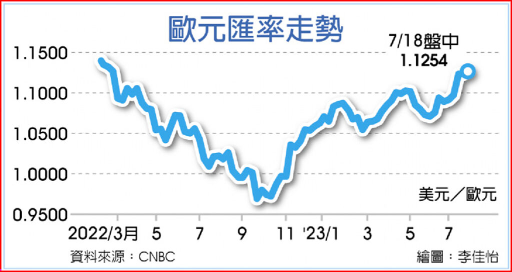 由於美元持續偏弱,歐元對美元一舉升上17個月新高。18日歐洲匯市盤中,歐元最高升至1.1275美元,上漲0.3%,創2022年第一季以來新高價。追蹤美元對6大對手貨幣表現的美元指數下滑至99.84,續創15個月新低。不過,德國銀行Helaba分析師指出,技術面指標顯示歐元呈現超買,短線拉回整理壓力激增。