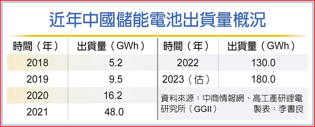 另外,高工產業研究院資料顯示,2022年大陸儲能電池的出貨量達130GWh,年增1.7倍,2023年預估可達到180GWh。