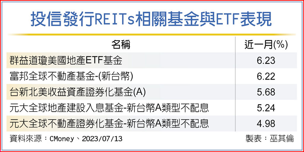 美國最新公布的通膨數據進一步降溫,令市場預期升息周期將接近尾聲,公債利差壓力改善也使近期REITs表現回穩,觀察近一月REITs相關基金與ETF表現,全數都呈現上漲,表現較佳、單月漲逾5%以群益道瓊美國地產ETF(00714)的6.23%拔得頭籌,其次為富邦全球不動產基金6.22%、台新北美收益資產證券化基金5.68%、元大全球地產建設入息基金5.24%,績效均相當亮眼。