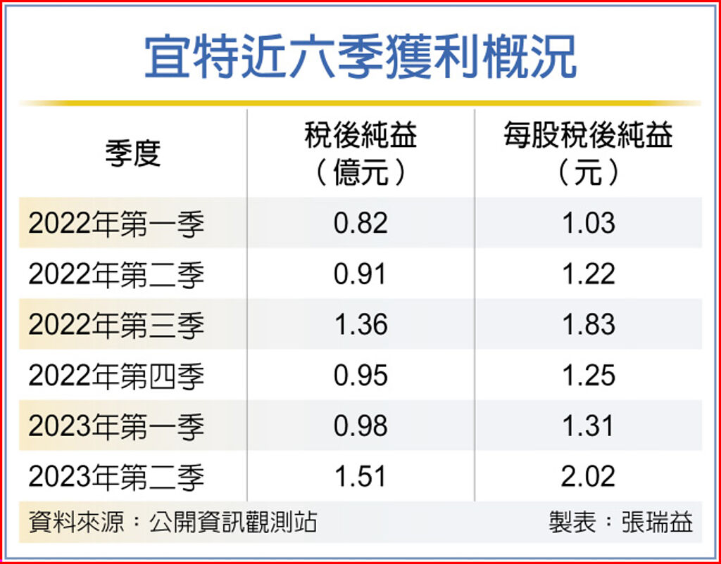 宜特第二季每股稅後純益約2.02元,較上季大幅增加54.20%,比2022年同期大幅增加65.57%,創下13季以來新高。
