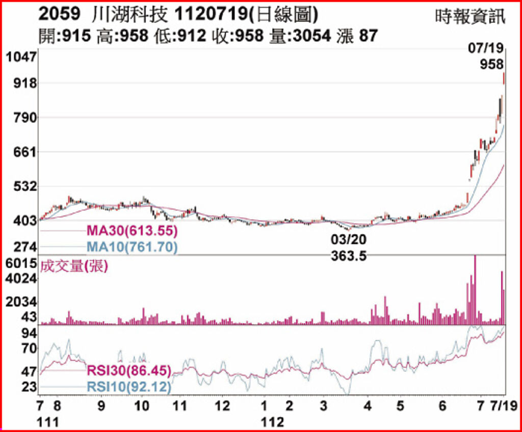 川湖(2059)19日受惠於投顧法人出具最新報告,在AI伺服器的風潮之下,川湖將為受惠者,激勵川湖股價續攻,來到漲停價958元,不僅再創歷史新天價,也躍居準千金股,以當日收盤價計算,川湖市值已攀升至912.9億元。