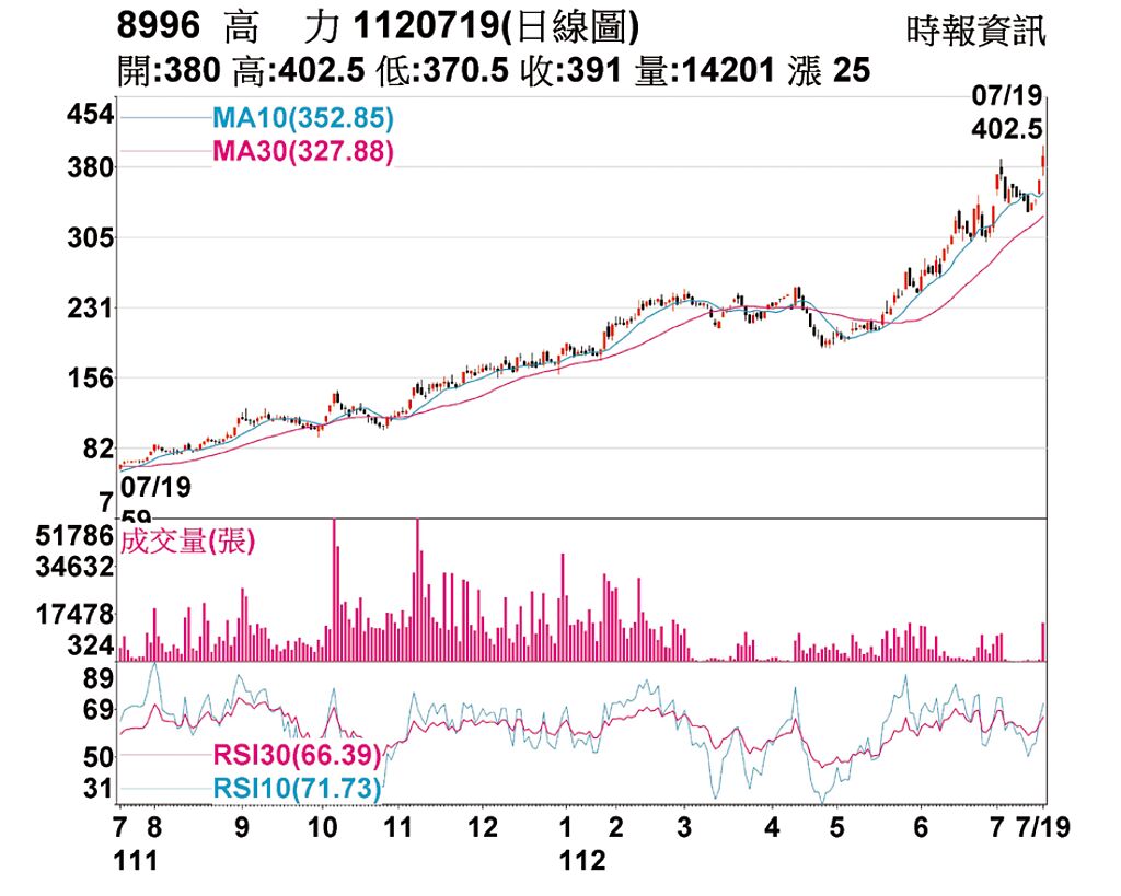高力(8996)受惠於業績成長題材,加上解除處置,19日買盤湧入,盤中一度創402.5元新高,終場收391元、上漲25元,成交逾1.4萬張為近四個月大量,三大法人同步買超合計1,408張。近一年股價大漲,4月除息後回測半年線再攻,近期因處置量縮盤整,19日跳空收紅再創歷史新高,帶動KD指標交叉向上、MACD值由負轉正,多頭氣勢強勁。