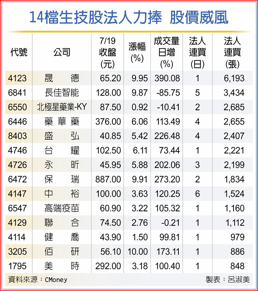 生技股集國內外諸多利多,激勵法人回頭加碼,18日收盤,有11檔攻上漲停,篩選股價收漲,且三大法人回頭加碼或者連買股有晟德、長佳智能、北極星藥業-KY、藥華藥、盛弘、台耀、永昕、保瑞、中裕、高端疫苗、聯合、健喬、佰研、美時等。