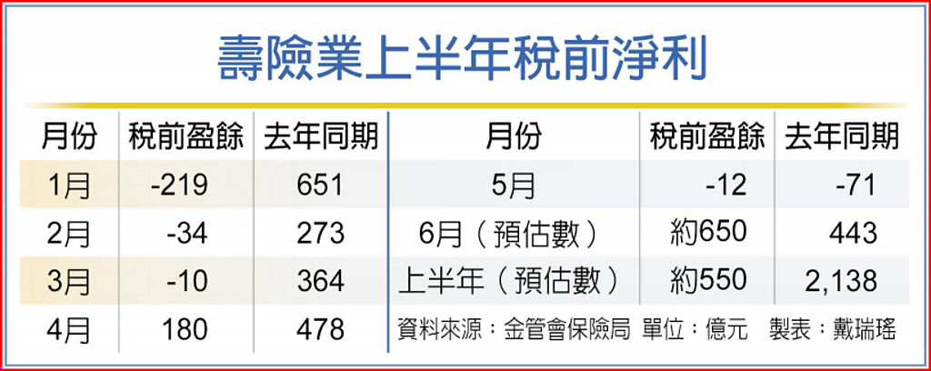 保險局統計,至5月底壽險業仍呈稅前虧損95億元,6月靠匯兌利益、資本利得與股息,將一口氣轉虧為盈。若上半年稅前盈餘約550億元,仍比去年同期稅前盈餘2,138億元衰退逾74%。