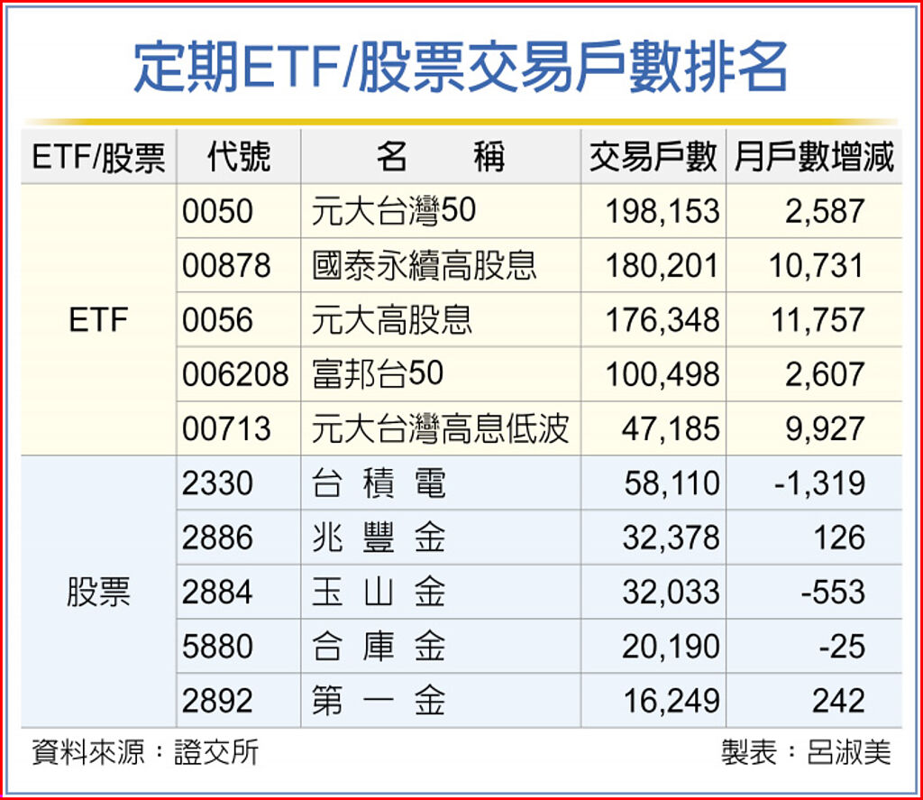 到6月為止,證券商承作定期定額ETF交易戶數前五名分別為元大台灣50、國泰永續高股息、元大高股息、富邦台50及元大台灣高息低波等,交易戶數各為198,153戶、180,201戶、176,348戶、100,498戶、47,185戶,全數創新高,其中,富邦台50首度出現突破10萬戶。