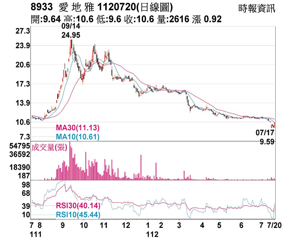愛地雅(8933)無懼歐洲客戶Vanmoof破產影響,20日在主力及外資力挺下,9時41分就攻上漲停,隨即賣盤湧現,漲停數度開打,直至9時54分,第四度拉至漲停價10.6元,並鎖死至終場,創連九跌之後,首度反漲,成交量2,616張。外資連13賣之後,20日首度反買,投信近40天來買賣超掛零,自營商近二天買賣超也掛零。因KD指標在低檔區同步向上,且漲停委買826張,若主力及外資買盤不變,本周股價可期。