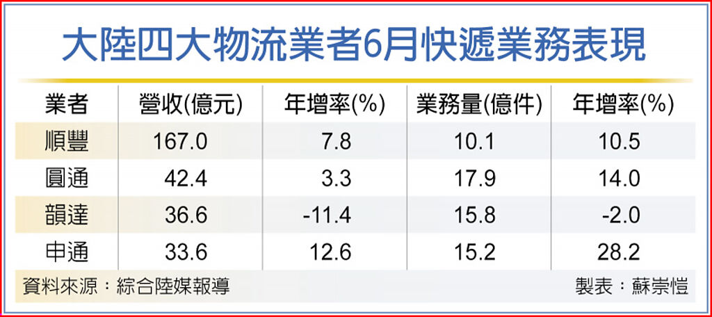 陸股上市四大物流業者6月經營數據19日出爐,結合此前數據顯示,2023年上半年順豐控股營收高達人民幣(下同)1,224億元,排名第一。期內圓通速遞、韻達股份、申通快遞營收分別為254億元、214億元、186億元。