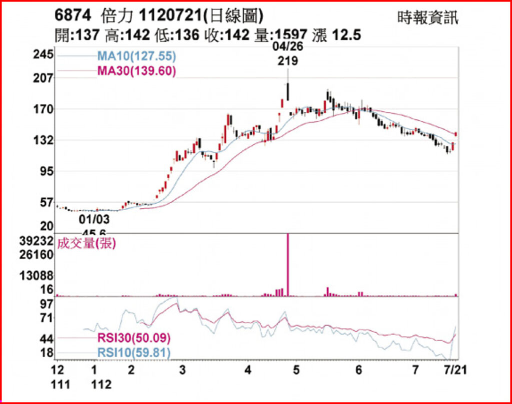 倍力(6874)21日開盤不久隨即漲停鎖死,以142元作收,同步攻克10日線及月線,在買氣回升下,成交量放大至1,590張,較前一日的338張,暴增近4倍。