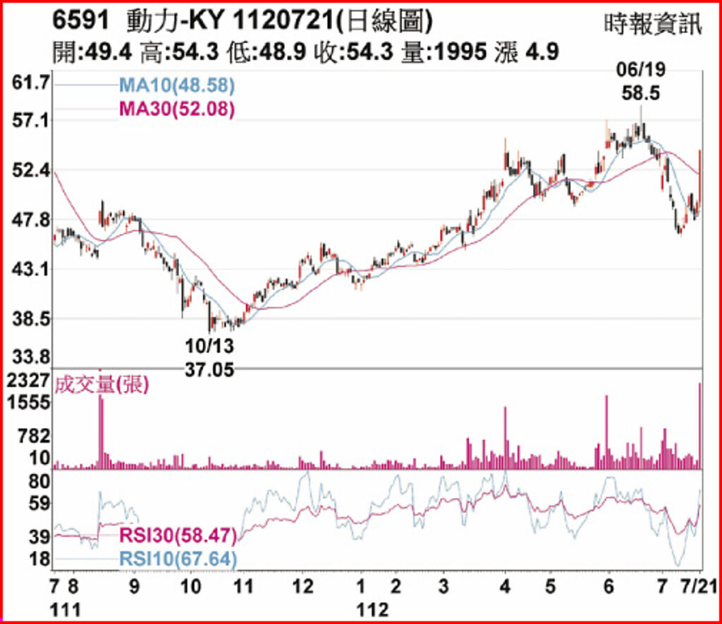動力-KY(6591)搭上散熱的特快車,股價也跟著飆車,21日同步以漲停作收,收盤價54.3元,一舉站上所有均線反壓,股價雖未能與其他散熱股同步創高,但填息率100.56%,3.939元現金股利全數落袋,表現也很吸睛。